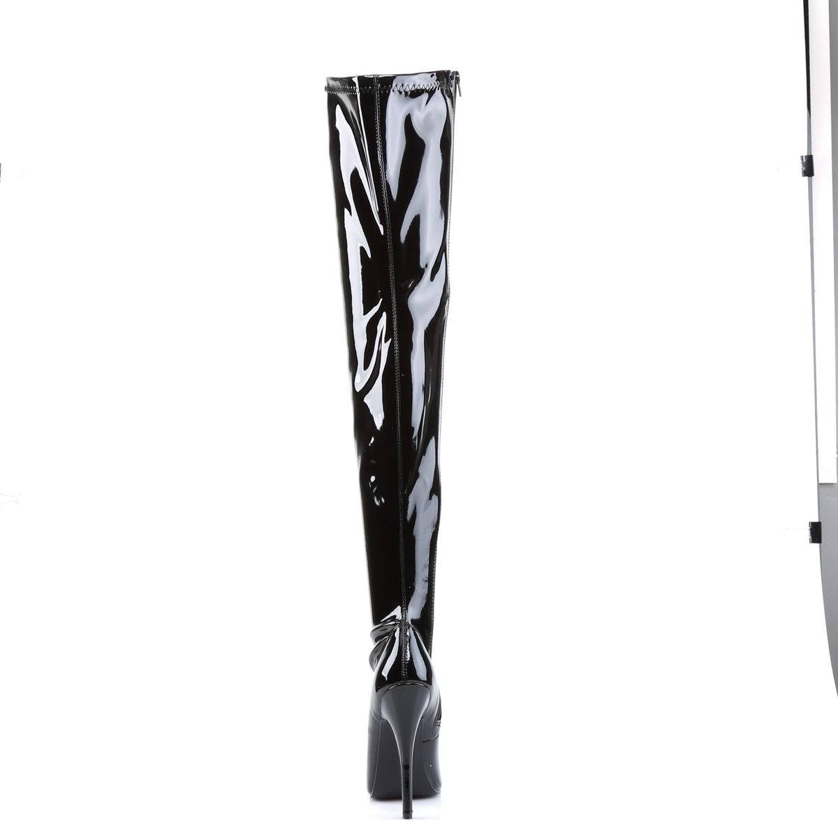 Domina-3000 are thigh-high patent stiletto boots with a firm, high-shine shaft that stays upright instead of collapsing or wrinkling.
