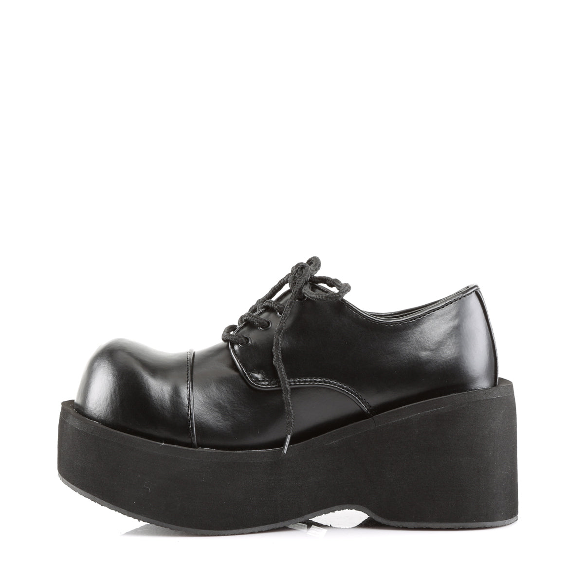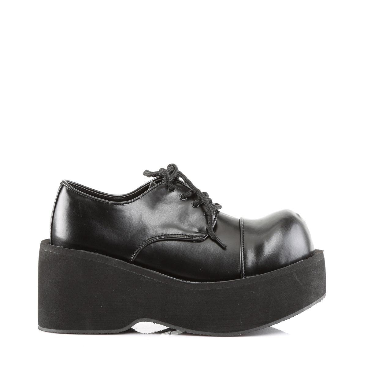 Chunky platform shoes with a smooth vegan leather upper. Rounded toe and lace-up design reference classic school silhouettes, reworked for gothic and alternative wear rather than all-day walking or work use.