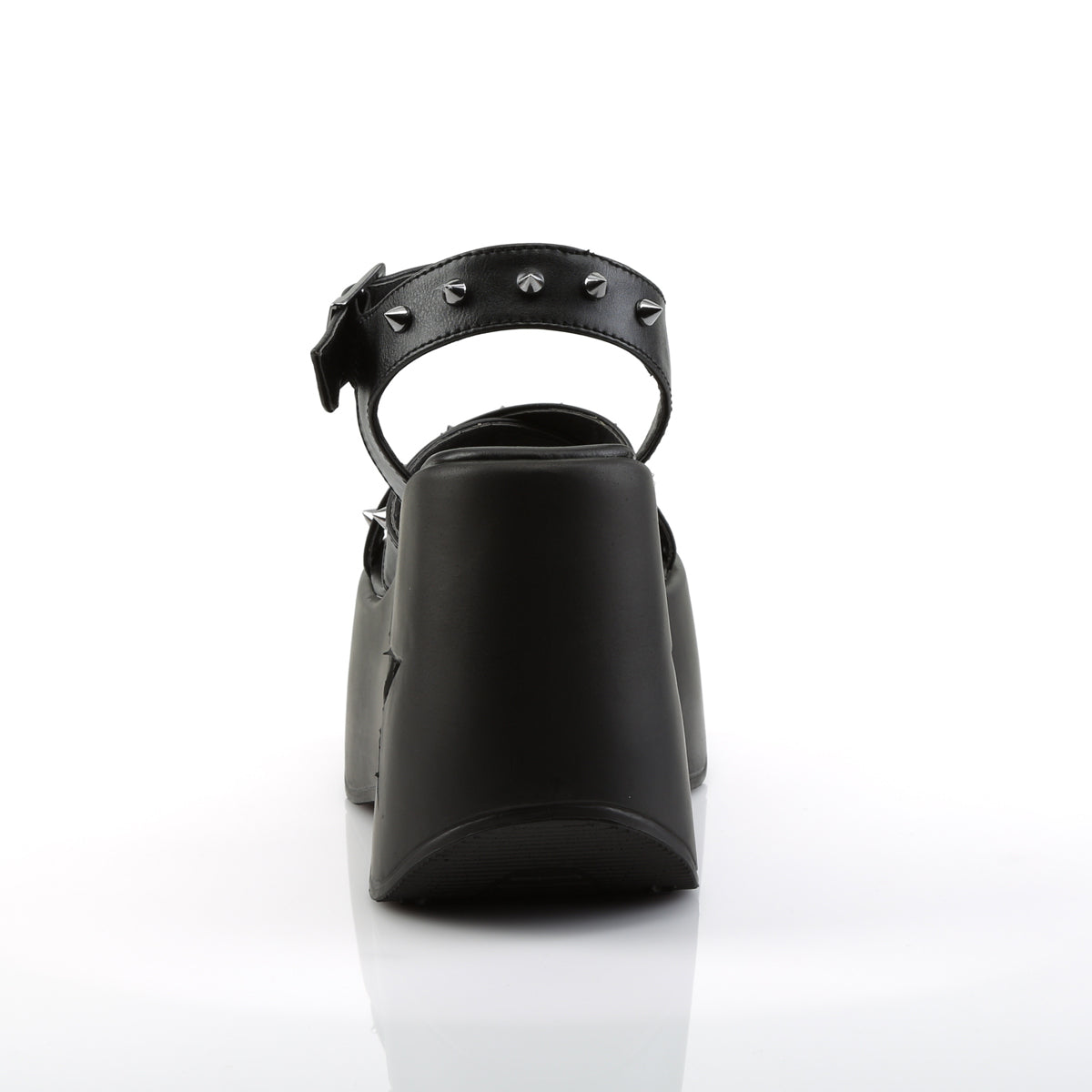 A black platform wedge sandal with a stable 5-inch base and studded straps.
