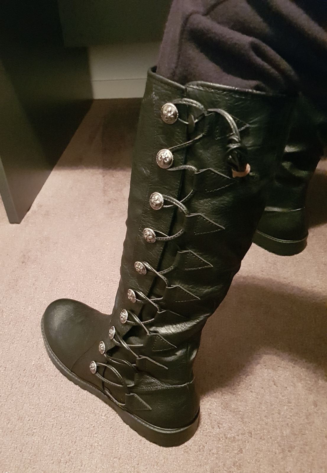 Strong rubber soles support a long, black vegan leather calf with a black textured surface. Ten buttons, finely decorated with the ancient fleur de lis symbol anchor the leatherette laces that snake along the length of the boot.